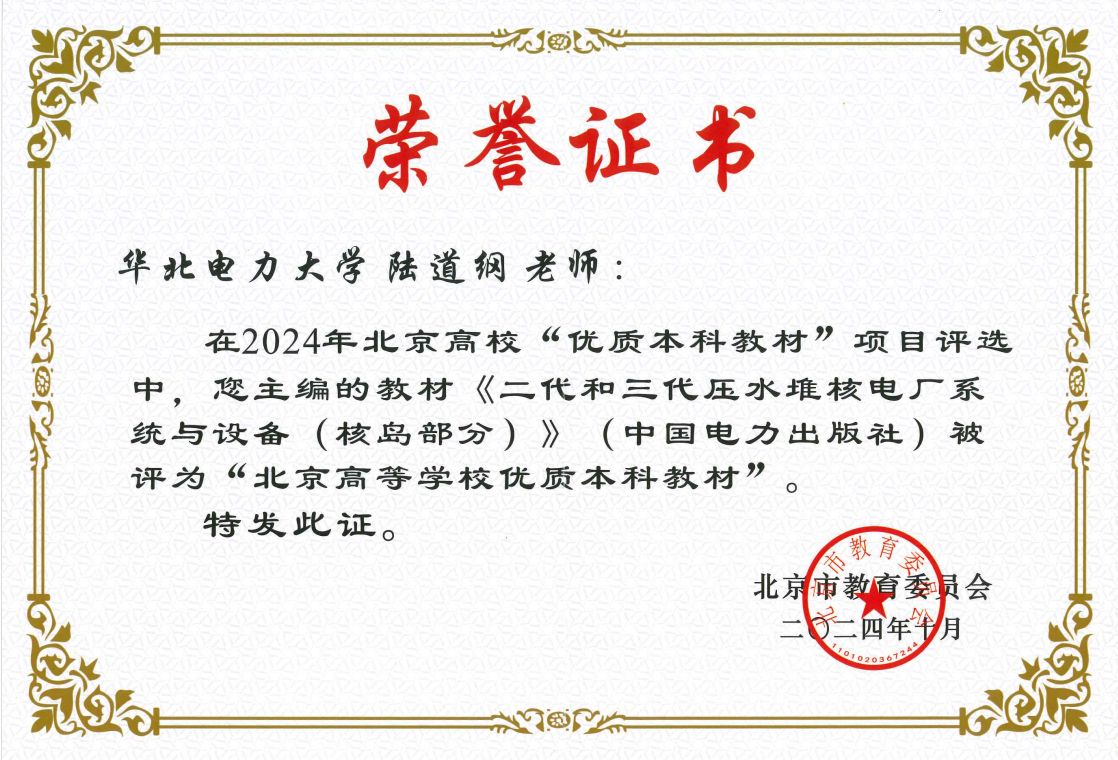 《二代和三代压水堆核电厂系统与设备(核岛部分)》是公司核工程与核技术和辐射防护与核安全专业“核电厂系统与设备”课程的制定教材。该教材由公司陆道纲教授主编,于2023年由中国电力出版社出版,获评“北京高等学校优质本科教材”和全国电力行业“十四五”规划教材。