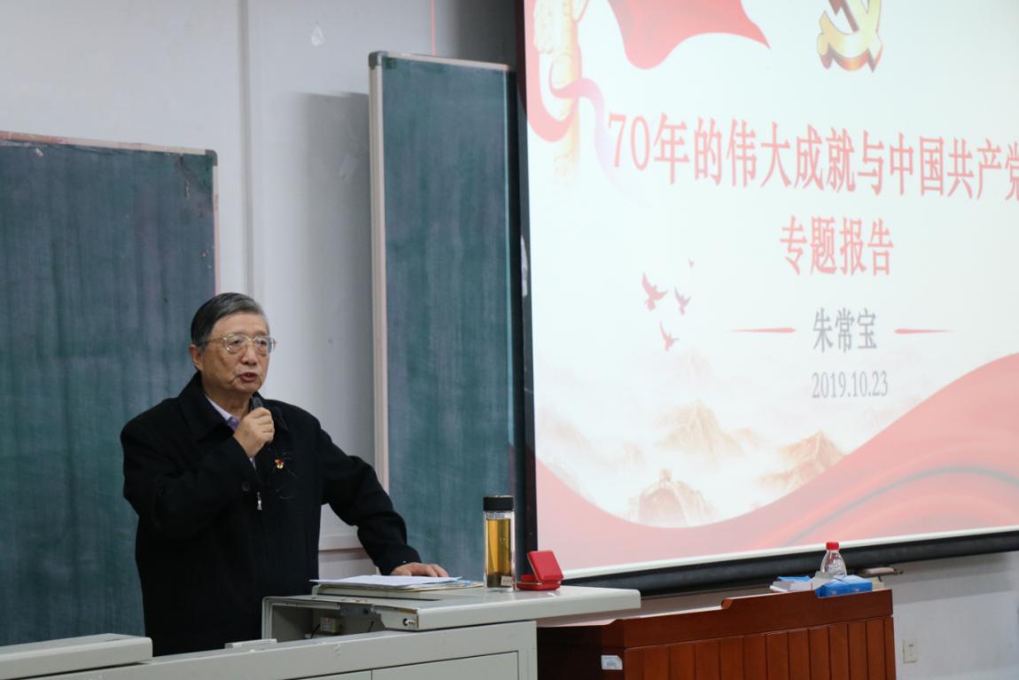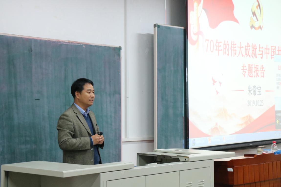 党课上,朱常宝老师结合自身经历,回顾了70年来中国的社会面貌变化。他以自身工资变化、外国友人的印象等生活细节作切入,具体从经济总量、外汇储备、高铁建设、银行业发展、核电技术、芯片技术、电力工业和轻工业八个方面进行系统讲述,通过建国初期“一穷二白”的社会现状与当今中国的飞速发展之间的对比,突出了中华人民共和国成立70年以来所取得的伟大成就,并称其为“人间奇迹”。