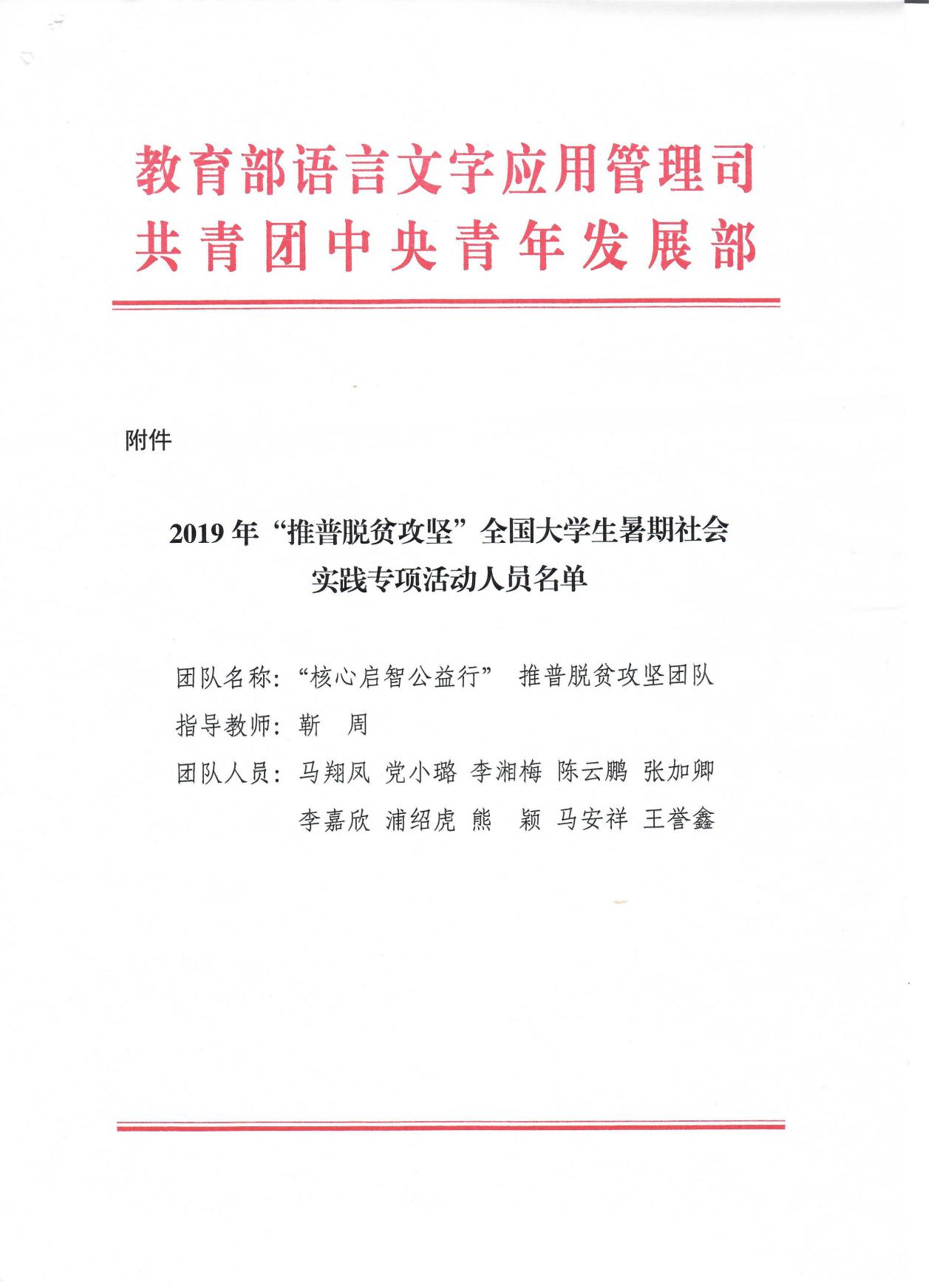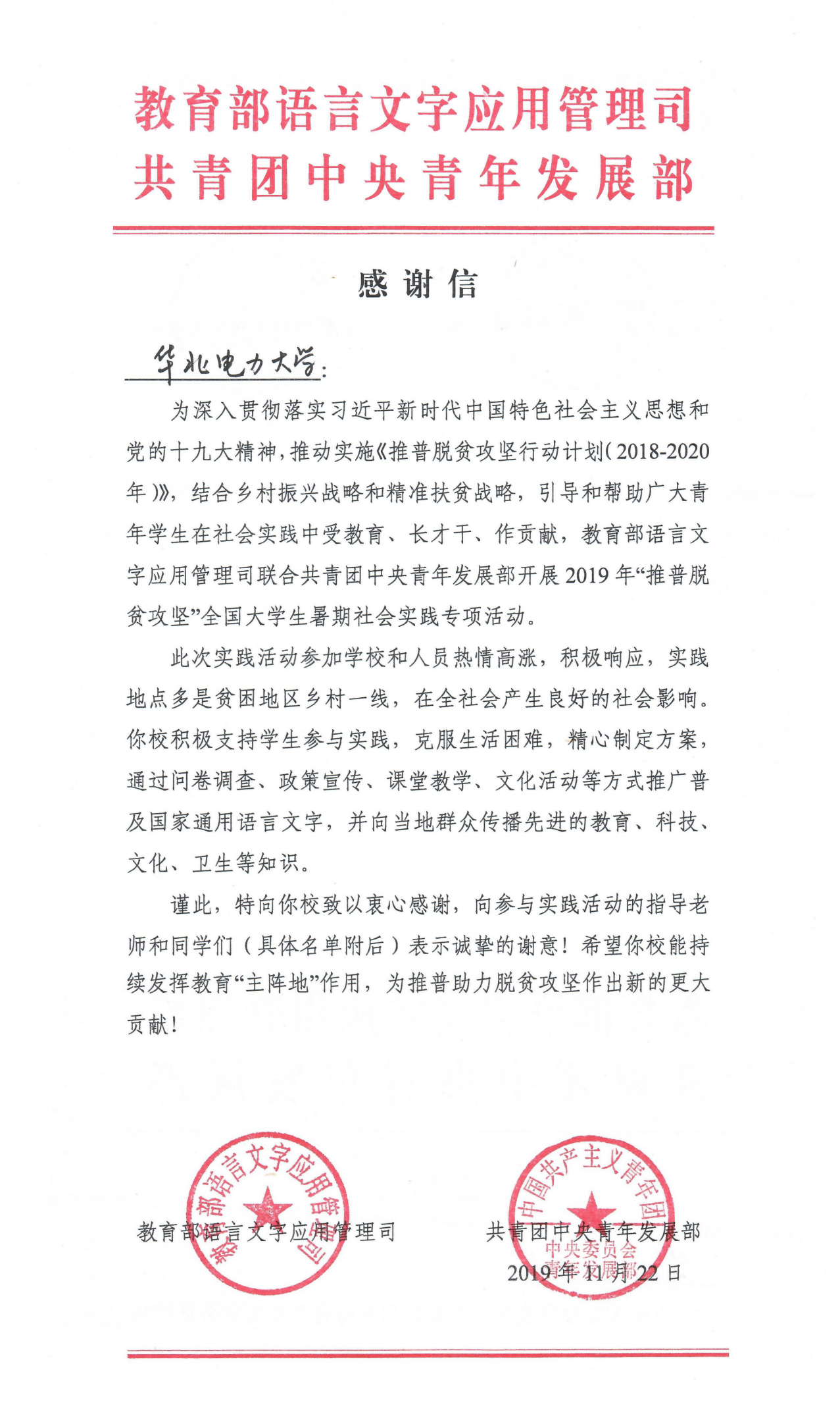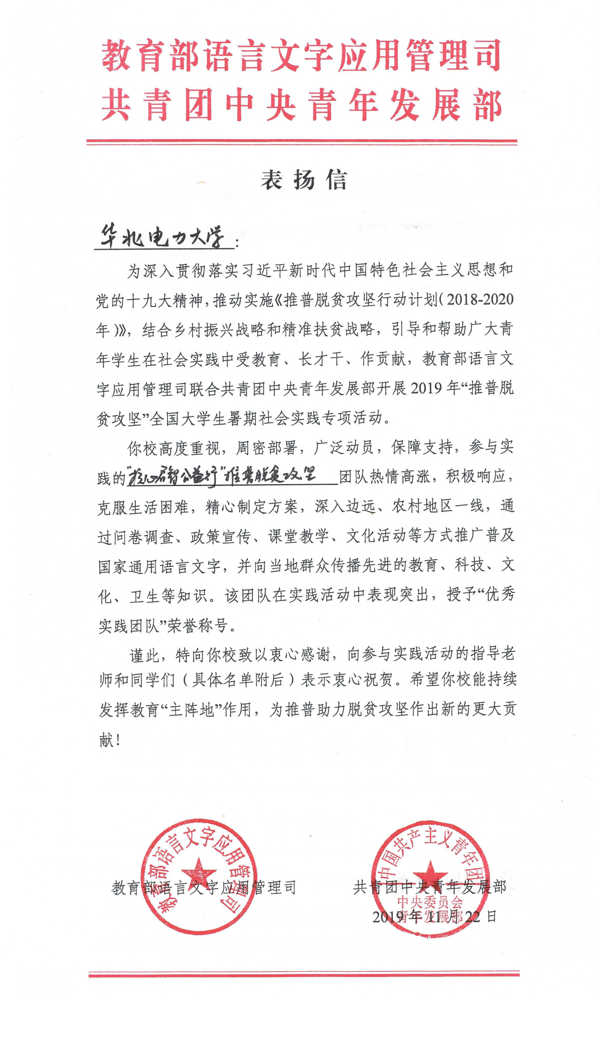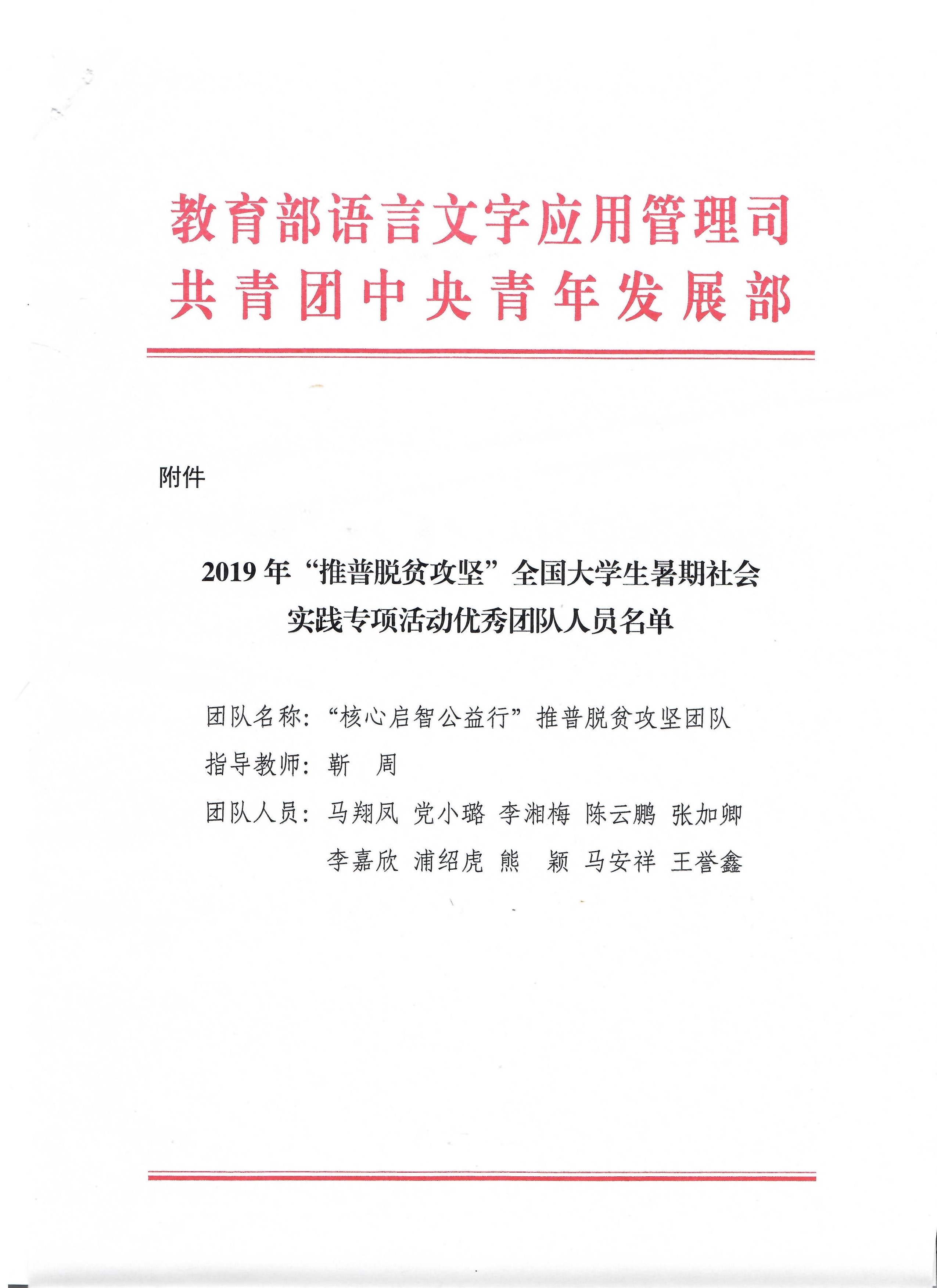 近日,教育部语言文字应用管理司、共青团中央青年发展部给公司发来感谢信和表扬信,书面感谢和表扬了必威betway组建的“核心启智公益行”推普脱贫攻坚社会实践队。表扬信中,教育部和团中央授予“核心启智公益行”推普脱贫攻坚社会实践队“全国优秀实践团队”荣誉称号。