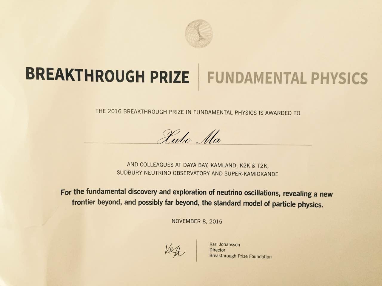 基础物理学突破奖是仅次于诺贝尔物理学奖的重要奖项,与诺贝尔物理学奖区别在于,基础物理学奖并不特别要求对理论进行实验求证,更注重奖励那些对物理学进步有推动作用的发现和预言。2016年基础物理学突破奖授予的7个领导人和他们领导的5个研究团队,包括王贻芳、陆锦标领导的大亚湾中微子实验团队,Atsuto Suzuki领导的日本KamLAND实验团队,Koichiro Nishikawa领导的日本K2K/T2K实验团队,Arthur B.McDonald领导的加拿大萨德伯里中微子天文台以及Takaaki Kajita、Yoichiro Suzuki领导的日本超级神冈实验团队,5个研究团队将平分该奖项的300万美元奖金。