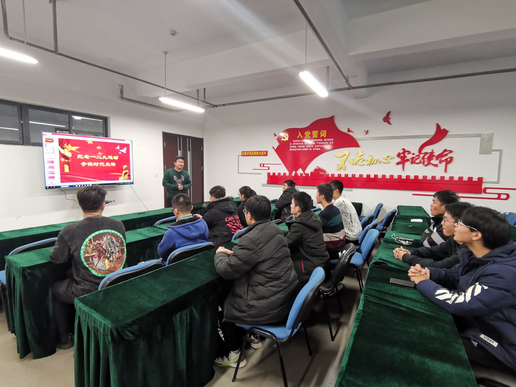 活动开始,靳周老师首先向在场的班干部介绍了一二九运动的历史背景以及整个事件的过程,带领大家再次走进这一历史事件。“一二·九”抗日救亡运动是中国共产党领导的一次大规模员工爱国运动。1935年12月9日,北平(北京)的大中员工数千人举行了抗日救国示威游行,反对华北自治,反抗日本帝国主义,要求保全中国领土的完整,掀起了全国抗日救国新高潮。